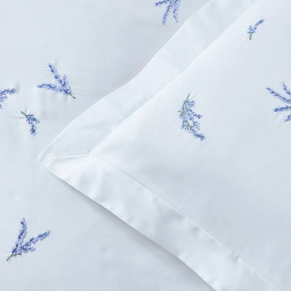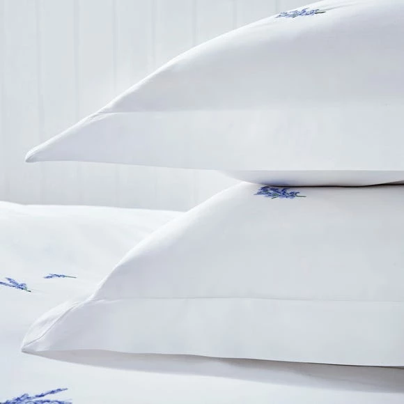 Featuring elegant embroidered sprigs of lavender scattered onto a luxurious 300 thread count cotton sateen base, this pillowcase pair is perfect for adding a timeless and elegant touch to your bedroom. Made from 100% cotton this pillowcase pair is soft, durable and machine wahsbale. A matching duvet cover and pillowcase set is also available.