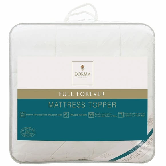 Available in a selection of sizes, this luxurious Dorma mattress topper has a crisp 100% cotton cover with a premium 230 thread count and fits mattresses up to 30cm deep. Filled with 100% spiral fibre for a fuller and plush feel with cassette construction for even distribution of the filling, this topper has elasticated cover straps to securely fit over your mattress.