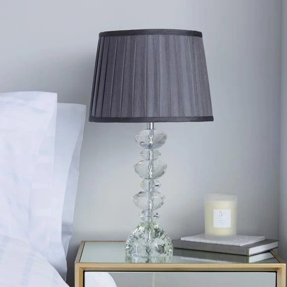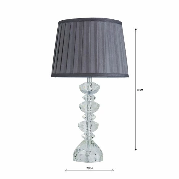Give your decor a glamorous touch with this stunning Dorma candlestick table lamp. Exquisitely crafted in a clear crystal base with metal rode in the middle for sturdy structure, this table lamp is supplied with a grey faux silk shade with a double taped trimmed detailed finish.