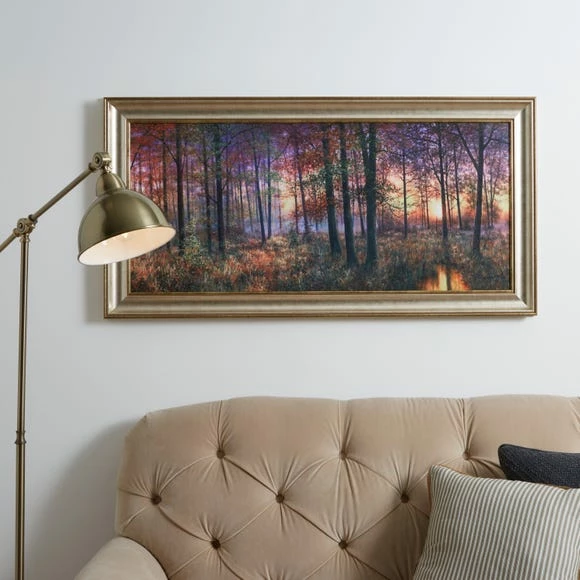 Featuring the Dorma Golden Coppice Dawn Framed Print, breathtakingly depicting an autumnal forest sun rise, this nature artwork features silhouette trees and colourful leaves against an orange background. This striking print by the designers at Dorma is complemented by a gold coloured frame.