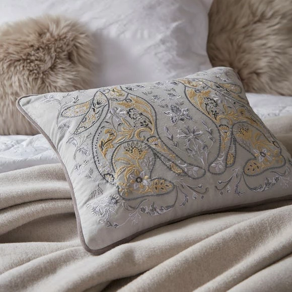 Featuring a charming mirror image of rabbits and an Arts and Crafts embroidered pattern this cushion boasts a nature-inspired design with a whimsical touch. Complete with velvet piping and a feather fill this cushion would look beautiful on any bedding.