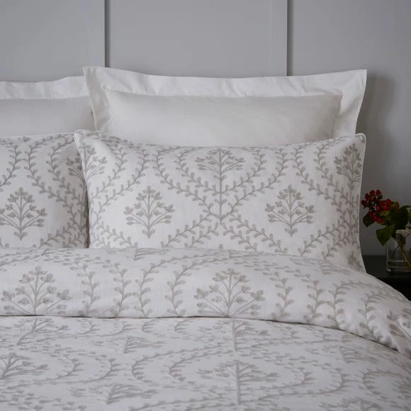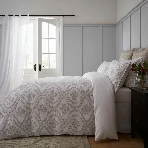 Crafted from 100% cotton slub for a softly textured feel, this simple design features a beautiful embroidered trellis, completed by a micro piped edge. secure the cover around the duvet with the easy to use zipper fastening. The set is available in 4 sizes so you can find the perfect fit for your bed.