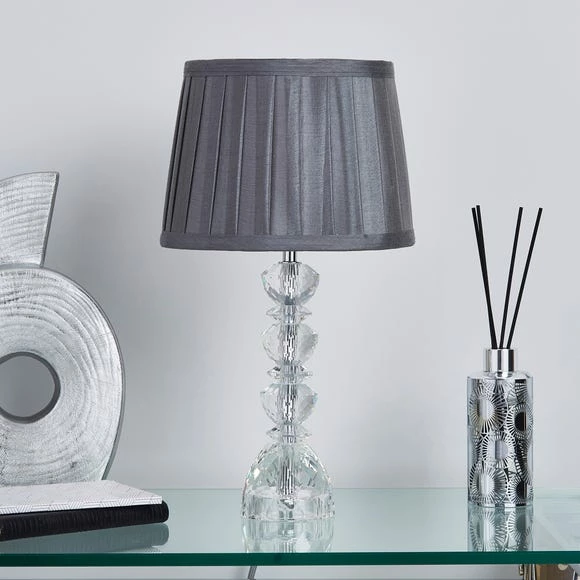 Give your decor a glamorous touch with this stunning Dorma Mini Genevieve table lamp. Exquisitely crafted with a clear, crystal base with a sleek chrome stem, this candlestick table lamp is finished with a grey pleated faux silk shade with a double taped trimmed detailed finish.