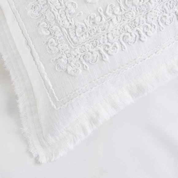 This Dorma Purity Burley hosts an irresistible combination of embroidered embellishments, lightly frayed trims and a delightfully crisp, white colourway. The Dorma Burley embroidered cushion has a handmade, global artisan feel that’s luxurious yet casual. Complete the look by pairing this cushion with the coordinating long boudoir cushion and continental pillowcase available.