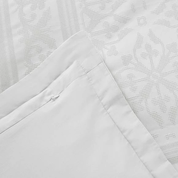 Boasting decorative ornamental patterns that are intricately woven into a 300 thread count panel, this duvet cover is not only stunning but a super soft addition to your bedroom. With a jacquard and waffle texture and a white background, this duvet cover would compliment any bedroom interior beautifully. This duvet cover is fastened with a zip and the set is machine washable making it easy to keep clean and fresh. This bedding comes with the Dorma 10 Year Guarantee. Other matching bedding is available.